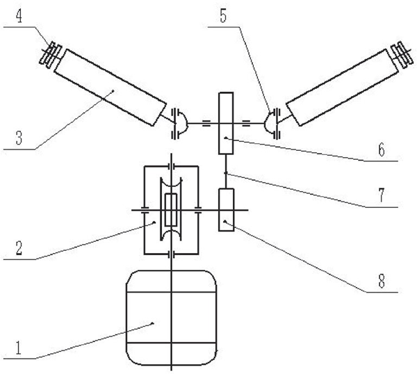 1- 電機;2- 減速機;3- 滾筒;4- 雙排鏈輪;5- 十字軸萬向節;6- 從動鏈輪;